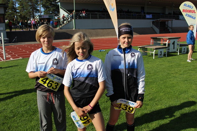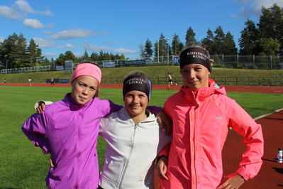 Kova oli urakka yhdeksänvuotiailla tytöillä omassa neliottelussaan, kun kenttälajeista hieman vaikeampia lajeja päästiin tekemään. Yhdeksänvuotiailla ei ole neliottelussa vielä aitajuoksua, mutta 40 metrin pikajuoksussa Sanni-Veera Viertola juoksi todella kovaa 6,84 ja sijoittui tässä lajissa kolmanneksi. Nea Hyvärinen ja Sonja Koskela juoksivat myös pikajuoksun hyvin. Sonjan aika oli 7,69 ja Nean aika 7,97. Nea juoksi toistamiseen tänä kesänä alle kahdeksan sekunnin, joten lähes ennätystahtia.